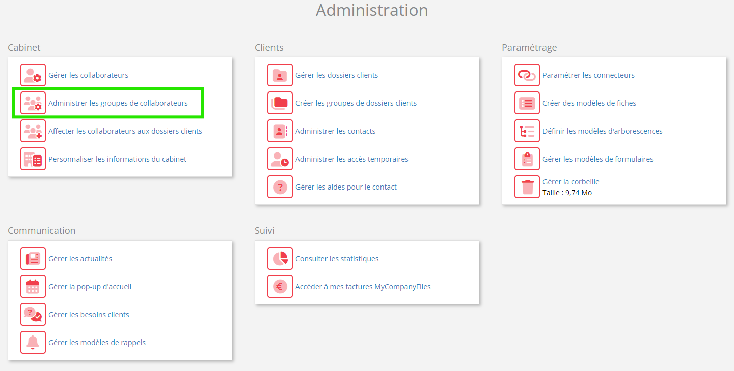 Pour gérer les groupes de collaborateurs, rendez-vous dans le module "Administrer les groupes de collaborateurs" depuis l’interface de gestion.
