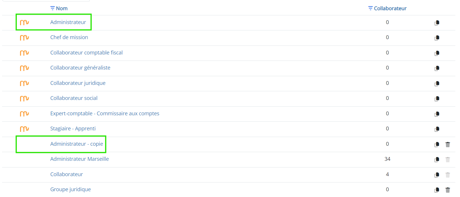 Il est possible de dupliquer un profil type MCF. La copie créée portera un nom du groupe dupliqué avec un suffixe "- copie", et sera déplacée dans la catégorie des groupes personnalisés. Ce profil dupliqué ne portera plus le tag MCF et pourra être modifié ou supprimé. Toutefois, la suppression sera uniquement possible si aucun collaborateur n'est associé à ce groupe.