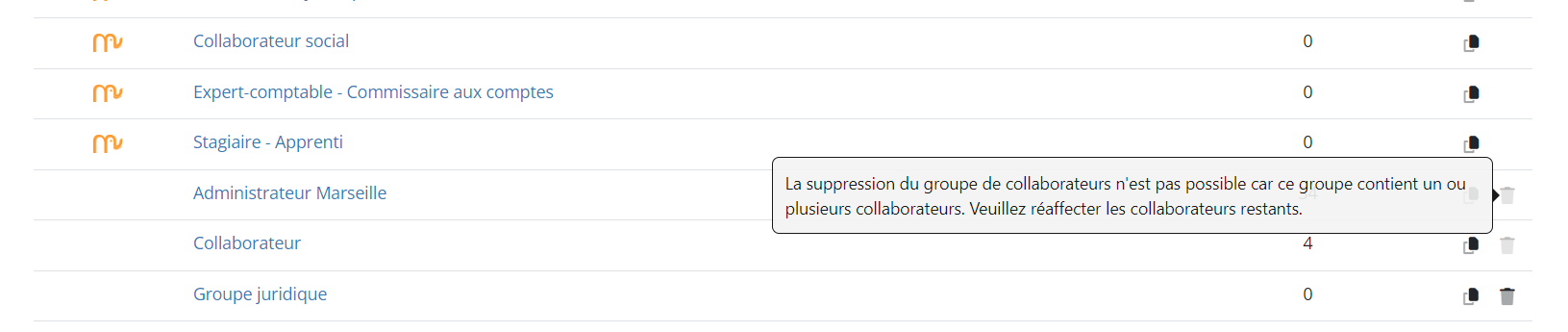 Un groupe MCF ne peut être supprimé que s’il ne contient aucun collaborateur. Si le groupe contient encore des collaborateurs, le bouton supprimé est désactivé et un message d’alerte s’affichera lorsque vous passerez la souris sur l'icône de suppression. Il sera alors nécessaire de réaffecter les membres du groupe à d'autres groupes avant de pouvoir le supprimer.