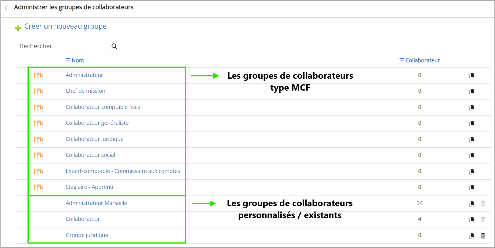 - Les groupes personnalisés : Ces groupes sont créés par votre cabinet et sont entièrement modifiables et supprimables.