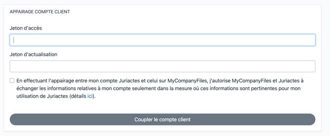 - Dans la page du connecteur MyCompanyFiles, section "Appairage compte client", renseignez les informations sur votre jeton d'accès et votre jeton d'actualisation, acceptez les conditions d'utilisation, puis cliquez sur le bouton "Coupler le compte client".