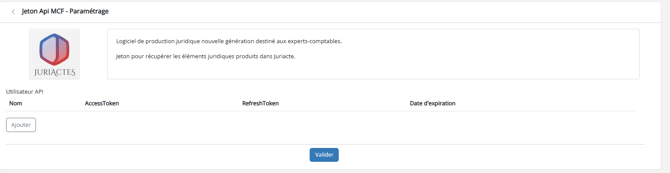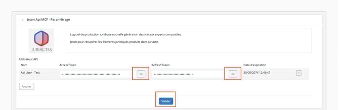 - Dans cette page vous devez ajouter un utilisateur API ( si il n'est pas déjà créé) puis noter votre jeton d'accès et votre jeton d'actualisation qui vous seront utiles pour l'étape suivante sur Juriactes.