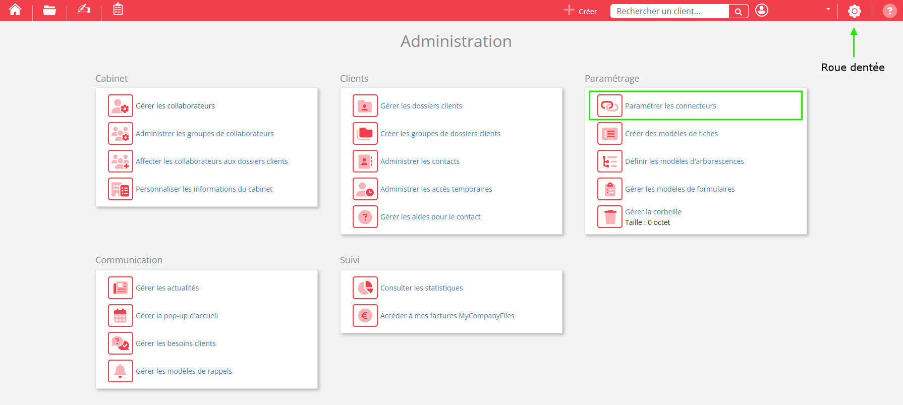 Pour commencer, rendez-vous dans la partie Administration (icône roue dentée), puis cliquez sur Paramétrer les connecteurs.