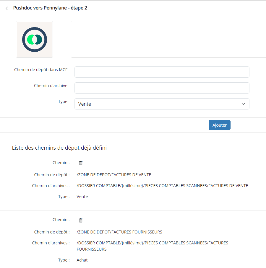 Une fois que vous avez rempli le Chemin de dépôt, le Chemin d'archive, et sélectionné le Type de document, cliquez sur le bouton Ajouter. Ce chemin sera alors ajouté à la Liste des chemins de dépôt déjà définis, visible sous l'interface.
