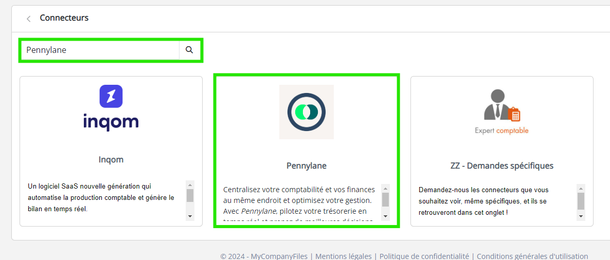 Ce connecteur va vous permettre d'envoyer les fichiers de MyCompanyFiles à Pennylane.