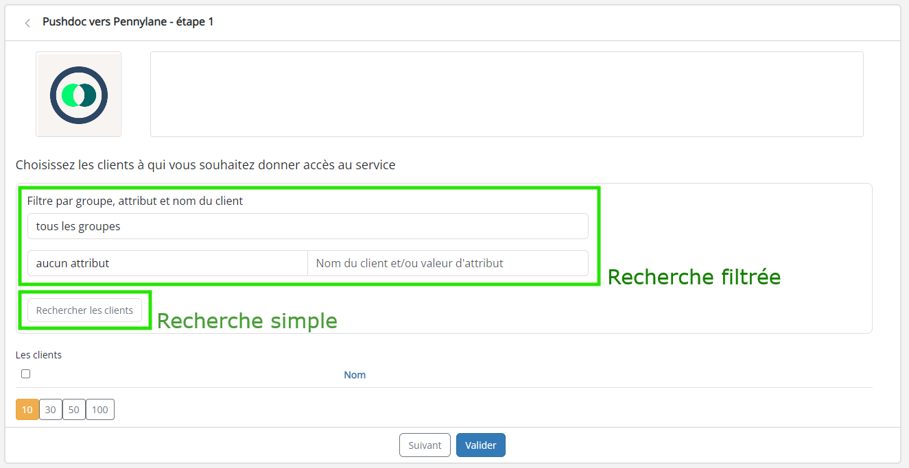 Après avoir cliqué sur le bouton Paramétrer, vous arriverez sur la première page de paramétrage du connecteur : Choisissez les clients à qui vous souhaitez donner accès au service.