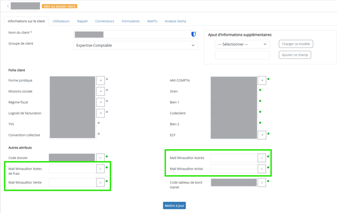 Pour les clients que vous avez sélectionnés, vous verrez des attributs qui commencent par "Mail Winauditor" qu'il faudra compléter avec les adresse e-mails de dépôts de Regate. Cela permet de créer le lien entre Regate et MyCompanyFiles.