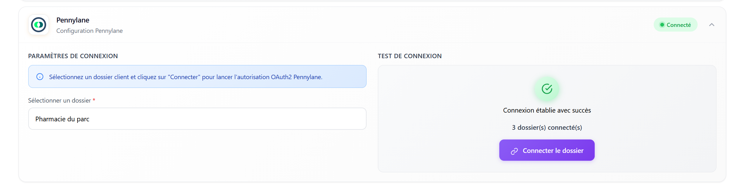 Les dossiers liés affichent désormais le statut Connecté avec le logo Pennylane.