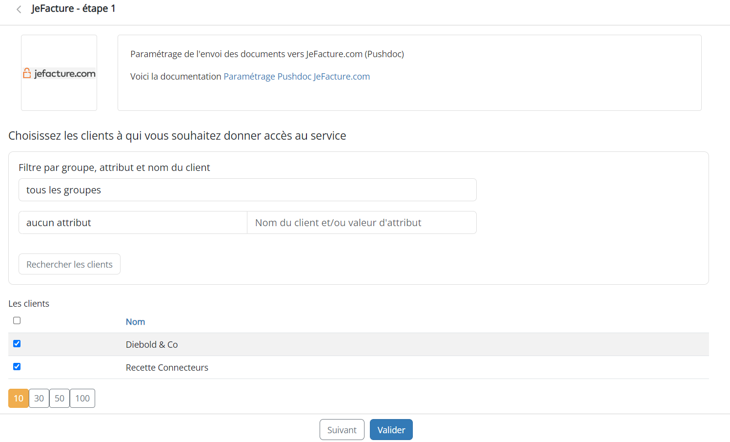 - Ajoutez ensuite les dossiers clients que vous souhaitez activer pour ce connecteur, puis cliquez sur "Valider".